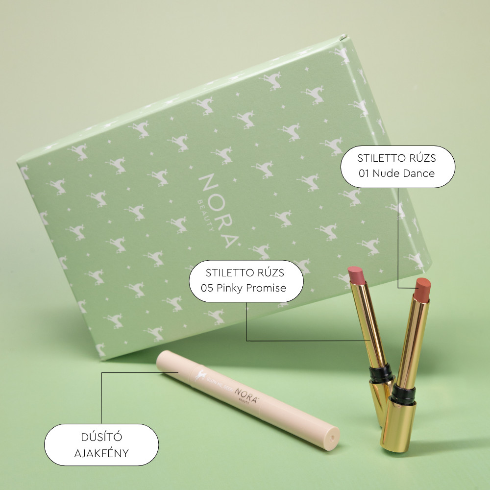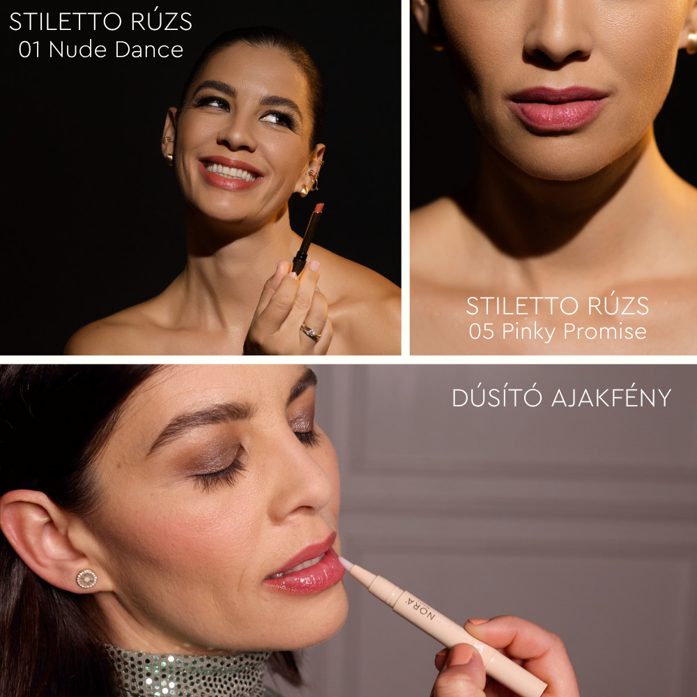 A Nora Beauty stiletto rúzsok színeit úgy válogattuk, hogy mindenki megtalálja azt az árnyalatot, amit egész nap szívesen visel. A színek többsége a nude és rózsaszín skálán mozog. Egy igazán piros rúzs az ünnepi alkalmakra viszont elengedhetetlen, így természetesen ez is a sorozat része.